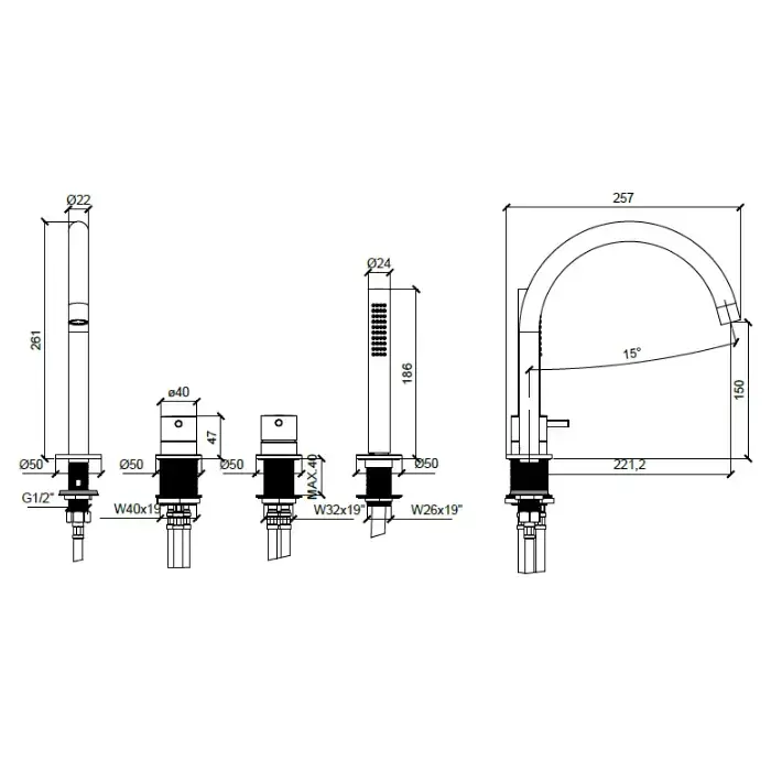 Almar Mixers Смеситель на борт ванны, 4 отв., с ручным душем, цвет: никель брашированный