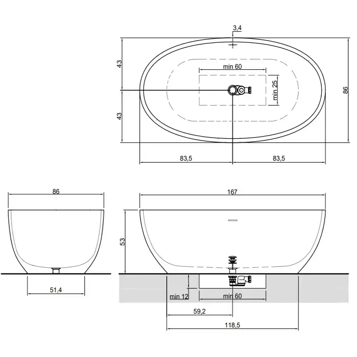 Antonio Lupi Reflex Ванна отдельностоящая 167х86х53см, с донным клапаном (graphit), сифоном, Cristalmood, цвет: Nebbia