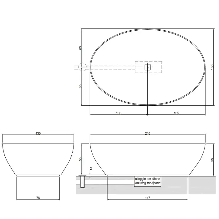 Antonio Lupi Solidea Ванна отдельностоящая 210х130х50 см из натурального камня, цвет: Nero Marquinia