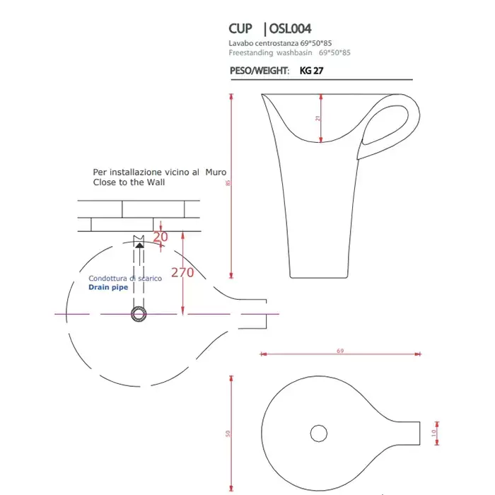 Artceram CUP Раковина 70х50х85 см, без отв., цвет: белый