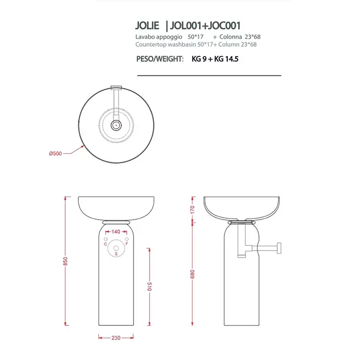Artceram Jolie Раковина 50см., на пьедестале, пристенный монтаж, цвет: белый глянцевый
