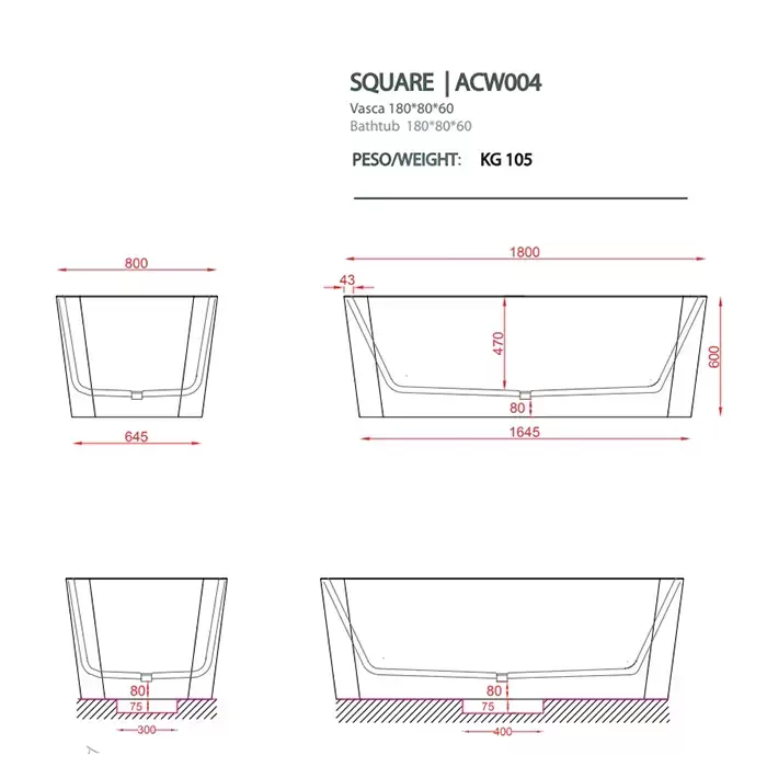 Artceram Square Ванна отдельностоящая, 180х80хh60см, с переливом и слив.крышкой, Livingtec, цвет: белый матовый