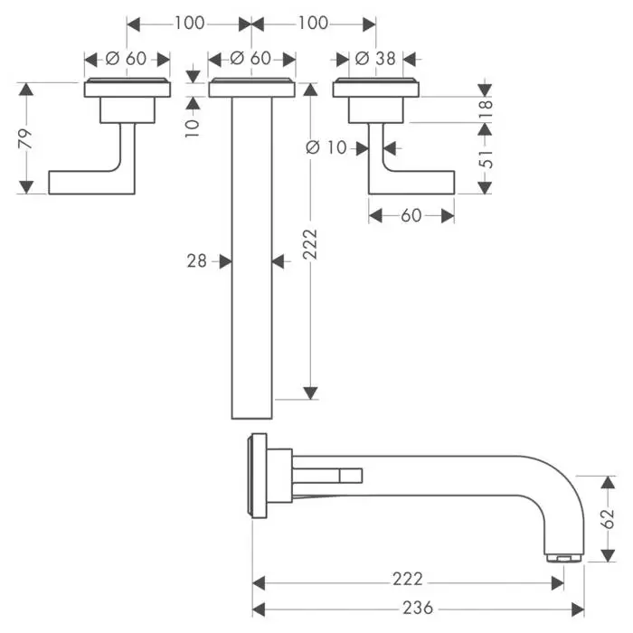 Axor Citterio Смеситель для раковины, на 3 отверстия, с рычаговыми рукоятками, розетками и изливом 162 мм, настенный монтаж, внешняя часть, цвет: хром