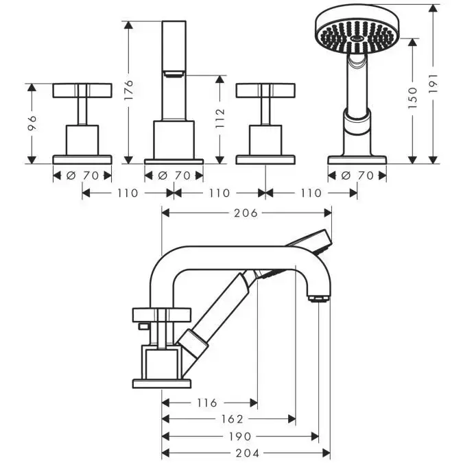Axor Citterio, Смеситель для ванны, на 4 отверстия, монтаж на плитку, с крестовыми рукоятками, внешняя часть, цвет: хром
