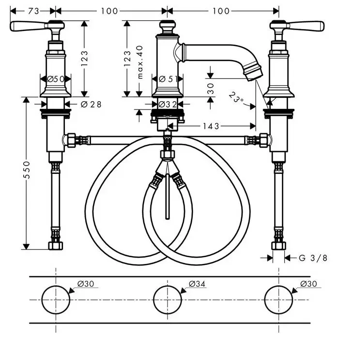 Axor Montreux Смеситель для раковины 30, на 3 отверстия, с рычаговыми рукоятками, с донным клапаном, цвет: никель