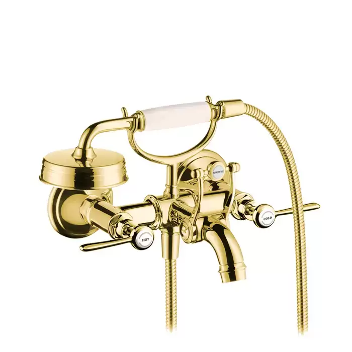 Axor Montreux Смеситель для ванны, настенный, на 2 отв, с ручным душем излив 249мм (рычажные рук.), цвет: полированное золото