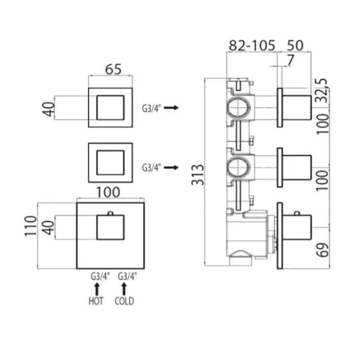 Bossini Cube Смеситель для душа, термостатический, встраиваемый, с запорным вентилем, на 2 - 4 выхода, цвет: хром