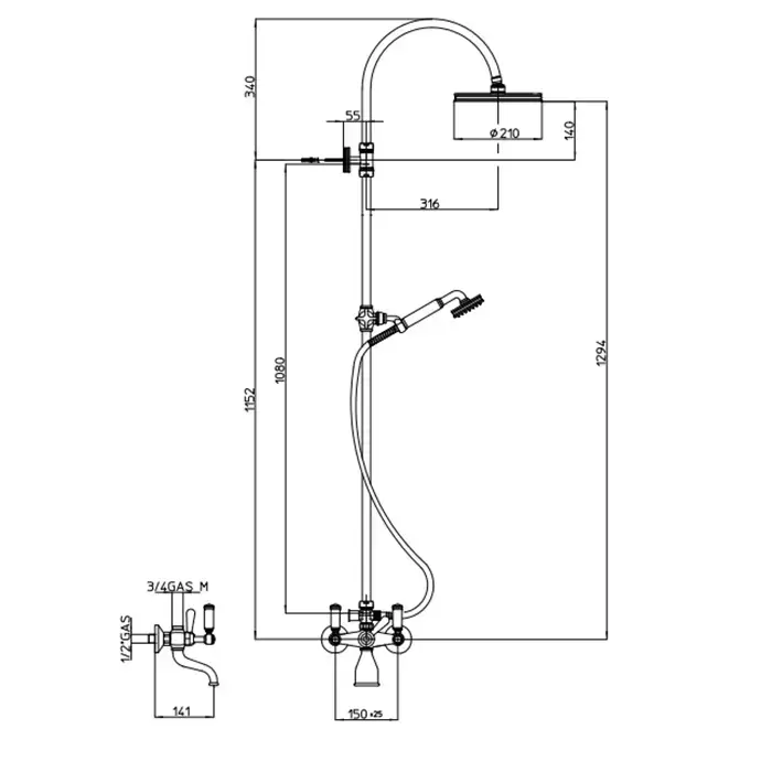 Bossini Liberty Душевая стойка, с верхним душем 21см, смесителем, со штангой и ручной лейкой , цвет: золото