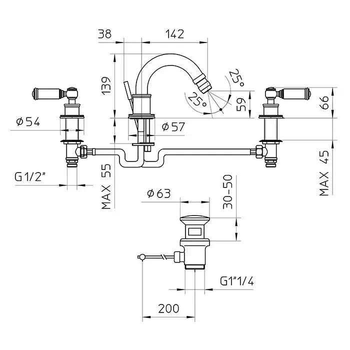 Bossini Liberty Смеситель для биде на 3 отверстия с поворотным изливом и заглушкой 1”1/4, цвет: золото