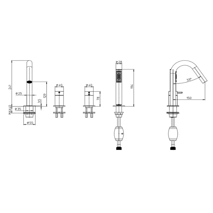 Bossini Nobu Комплект на борт ванны на 4 отверстия, с выдвижным ручным душем, шлангами и противовесом, цвет: нержавеющая сталь