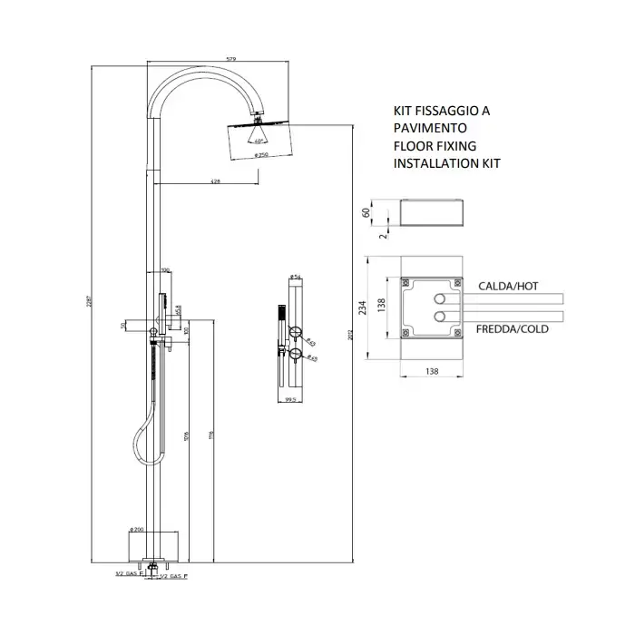 Bossini Tetis Душевая колонна с ручным душем, 2мя прогрессивными смесителями и верхним душем 25см., напольная, цвет: хром