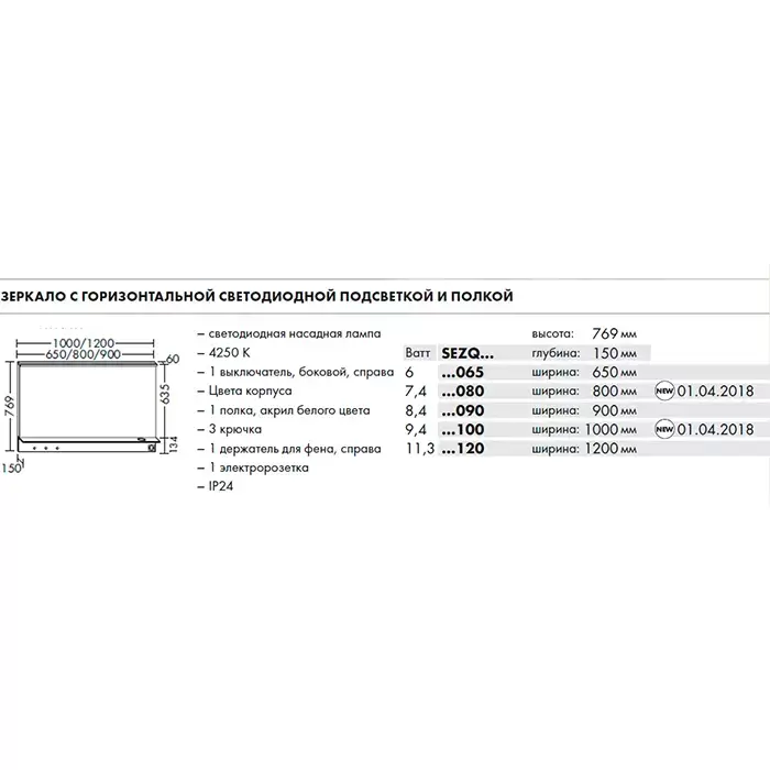 BURGBAD Eqio Зеркало с полкой , светодиод подсв.120х76.9х15см,выкл сбоку справа, 3 крючка, держ для фена справа. цвет серый F2010
