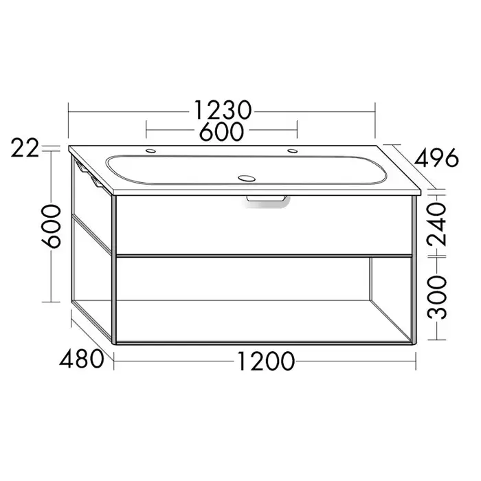 Burgbad Vry Комплект мебели 1230х496х600 мм, подвесной, 1 ящик, 1 полка, раков белая глянц с 2 отв для смес, ручка G0253, цвет белый матовый