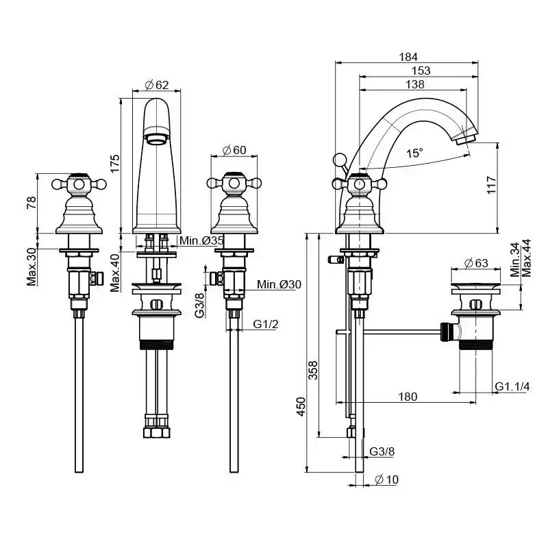 Carlo Frattini Elizabeth, Смеситель на раковину на 3 отверстия, цвет: Хром