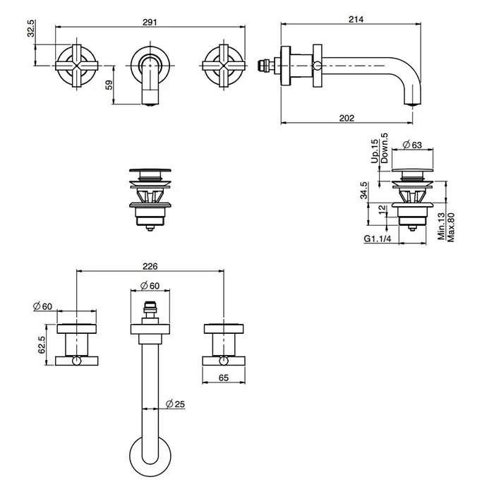 Carlo Frattini Maxima Смеситель для раковины, встраиваемый, на 3 отв., излив 20см., внешняя часть, с донным клапаном, цвет: хром