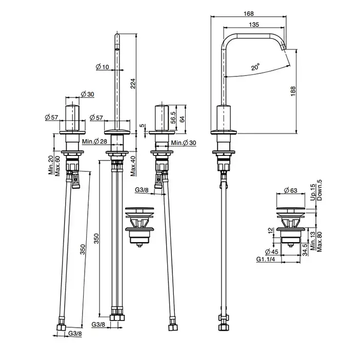 Carlo Frattini Sottolavabo Смеситель для раковины, на 3 отверстия, без ручек, поворотный излив Ø 10 мм., с донным клапаном click-clack, цвет: золото