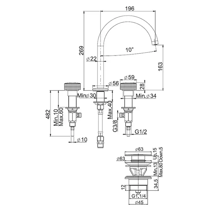 Carlo Frattini Texture Collection Смеситель для раковины, на 3 отверстия, донный клапан click-clack, цвет: золото