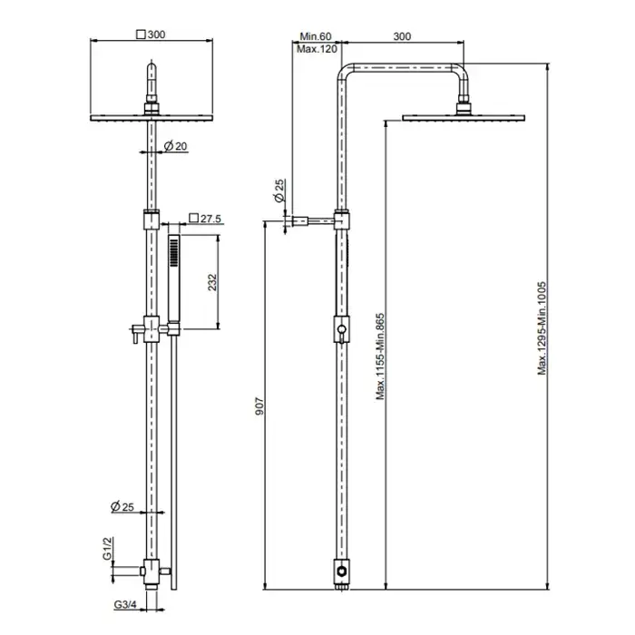 Carlo Frattini Wellness Душевая стойка с переключателем, верхним душем 300х300 мм. из латуни, ручным душем и шлангом 1500 мм., цвет: хром