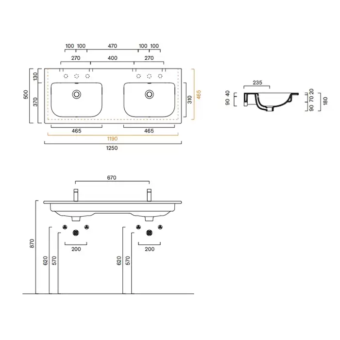 Catalano Italy Раковина двойная 125х50см, без отв., цвет: белый глянцевый