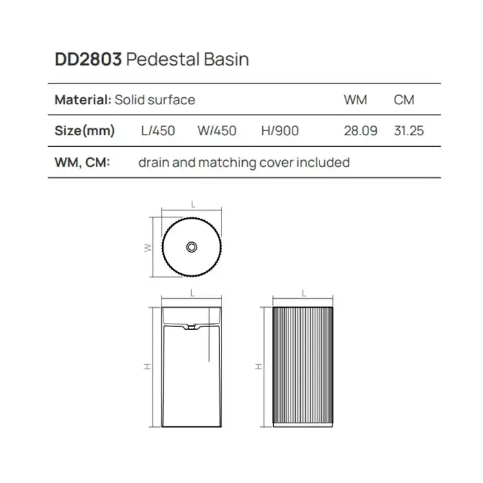 Dea Design Pedestal Basin Раковина 45х45х90см., напольная, без отв., Solid Surface, цвет: White №18