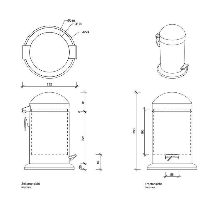 Decor Walther TE 30 Ведро 17xh31см, с педалью и крышкой, напольное, цвет: черный / сталь полированная