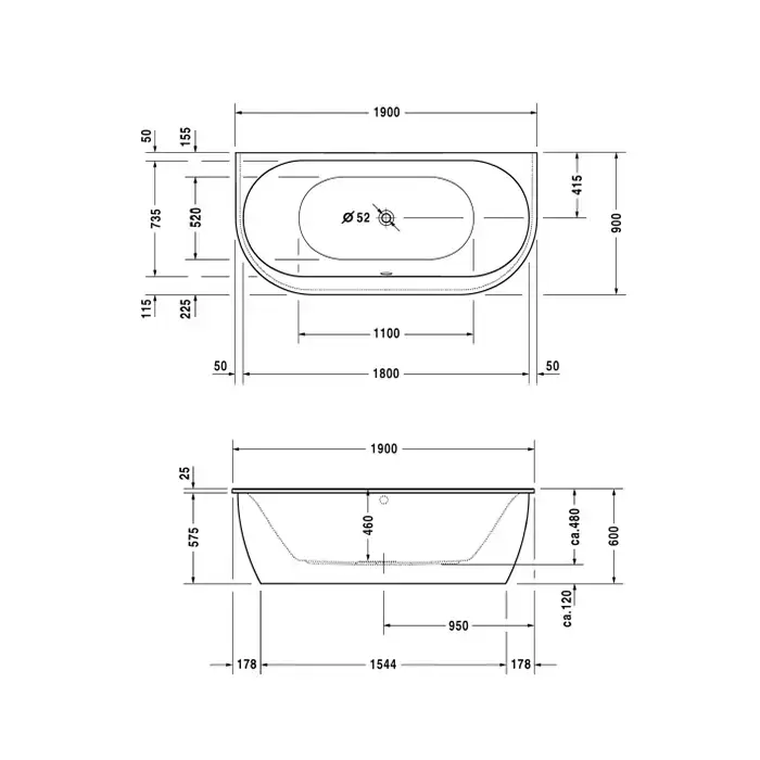 Duravit Darling New Ванна 190х90см, акриловая, пристенный вариант, с панелью и ножками,с 2 наклонами для спины, цвет: белый