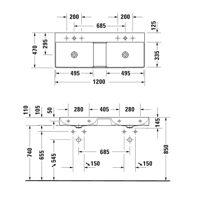 Duravit DuraSquare Раковина подвесная 120х47см, с отметками на 2 отв., двойная, без перелива, с крепежом, цвет: белый