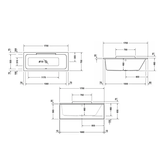 Duravit DuraStyle Ванна 170х70x48см,, прямоугольная, встраиваемая или версия с панелями и ножками, с наклоном для спины справа, цвет: белый