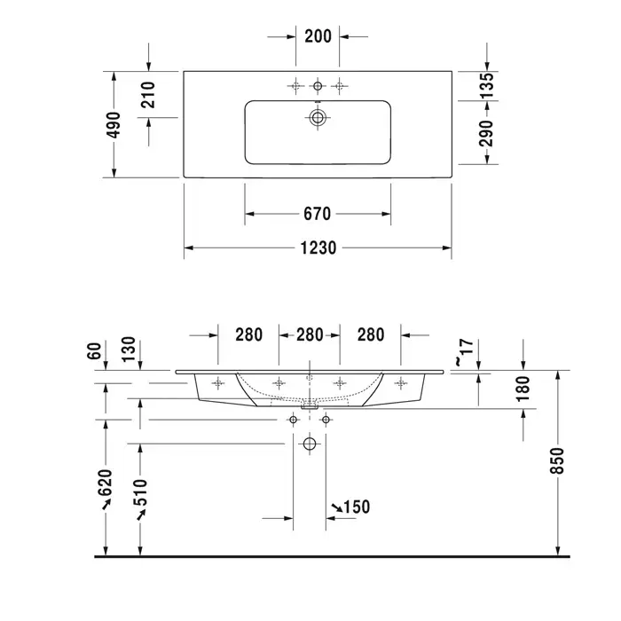 Duravit ME by Starck Раковина подвесная 123x49см., без отв., цвет: белый