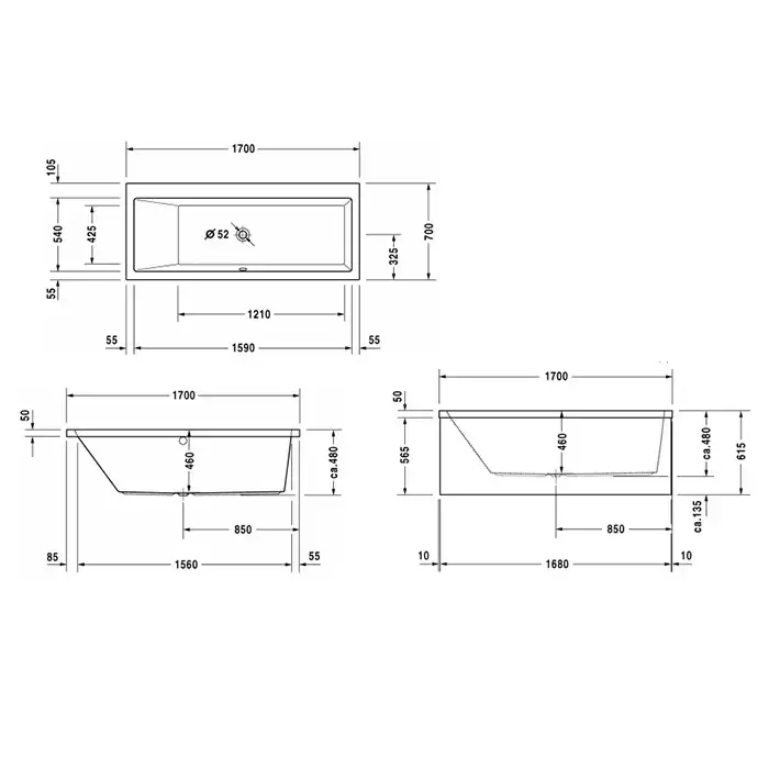 Duravit VERO Ванна 170х70см, акриловая, прямоугольная встраиваемая или с панелями, наклон спины слева, цвет: белый