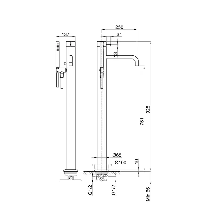 Fantini AF/21 Смеситель для ванны, напольный, излив: 250 мм, цвет: матовая натуральная сталь