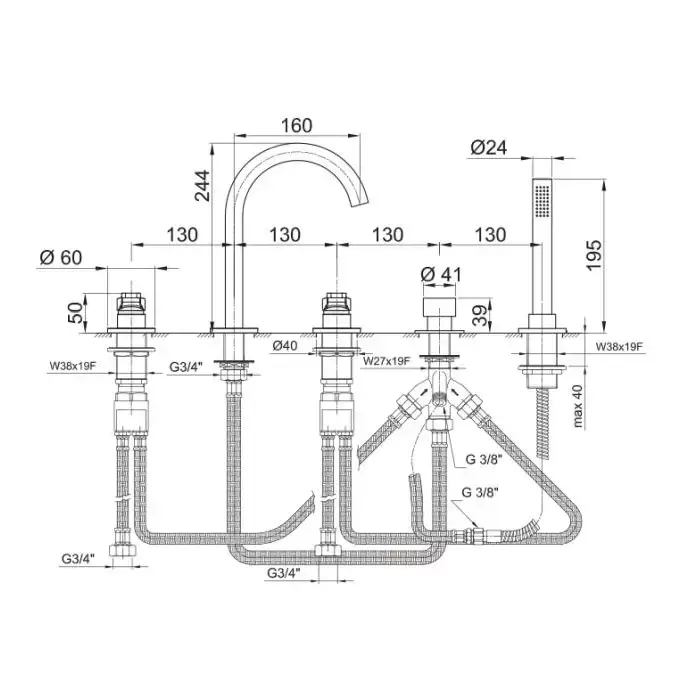 Fantini AL/23 Смеситель для ванны, набортный, 5 отв., излив: 160 мм, цвет: хром