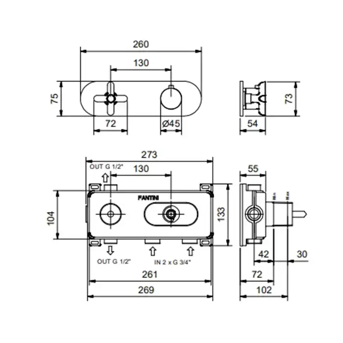 Fantini Icona Classic Смеситель для душа, встраиваемый, термостатический, на 2 источника, 3/4", (наружняя часть), цвет: Matt Gun Metal PVD