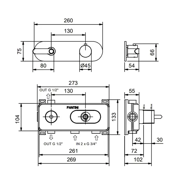 Fantini Icona Deco Смеситель для душа, встраиваемый, термостатический, на 2 выхода, (наружняя часть), цвет: хром