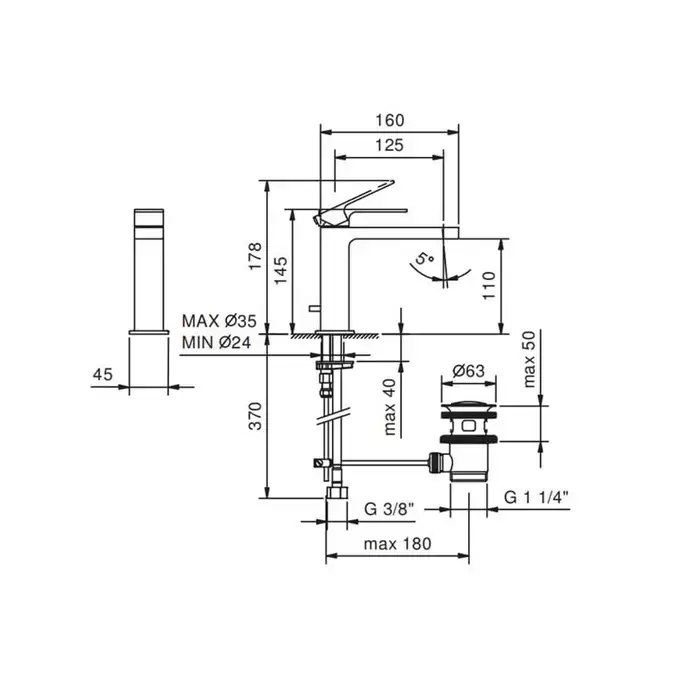 Fantini Mint Смеситель для раковины на 1 отверстие, однорычажный, излив 125 мм., с нажимным донным клапаном, цвет: матовая натуральная сталь