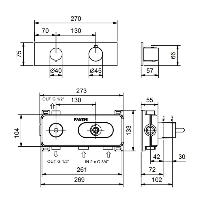 Fantini Nostromo Смеситель для душа, термостатический, встраиваемый, на 2 потока , с поворотной ручкой, цвет: Matt British Gold PVD