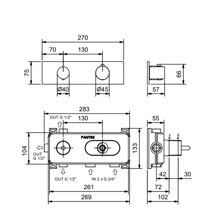 Fantini Nostromo Смеситель для душа, термостатический, встраиваемый, 3/4'', 3 потока, (наружная часть) цвет: Matt British Gold PVD