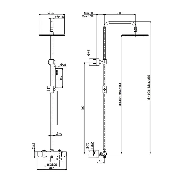 Fima Carlo Frattini Душевая стойка с термостатическим смесителем, верхний душ металлический Ø250 мм., ручной душ и шланг 1500 мм., цвет: черный матовый