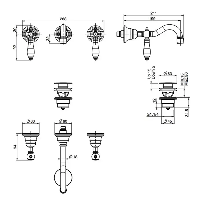 Fima Carlo Frattini Herend Смеситель для раковины, встраиваемый, излив: 19.9см., черные ручки, цвет: хром