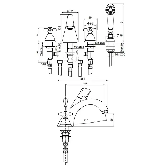Fima Carlo Frattini Olivia Смеситель на борт ванны, на 4 отв., с ручным душем, цвет: золото