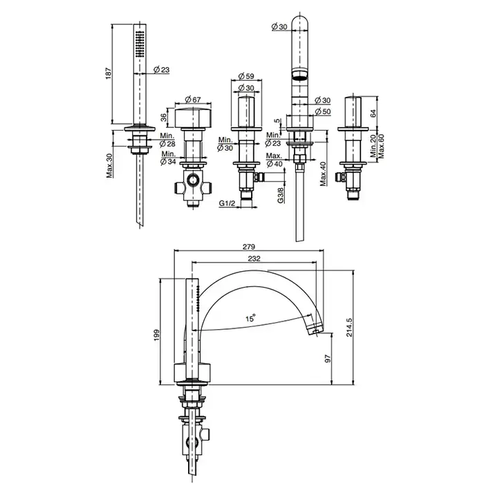 Fima Carlo Frattini So Смеситель на борт ванны, с 5 отв., с ручным душем, цвет: черный матовый