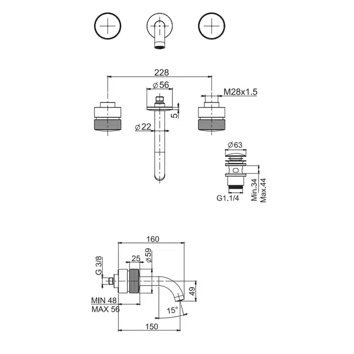 Fima Carlo Frattini Texture Collection F5601/5HCR Смеситель для раковины на 3 отв., настенный, излив 150 мм, донный клапан click-clack, ручки "H", БЕЗ накладок, внутр. часть (F2230) в комплекте, цвет: хром