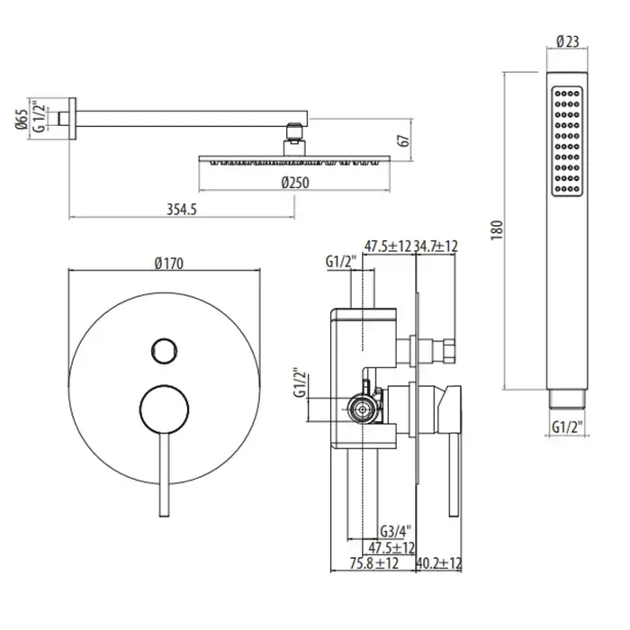 Gattoni Circle One Комплект для душа со встроенным смесителем, перекл. на 2 вых, с ручной лейкой и верхним душем 250мм, цвет: хром