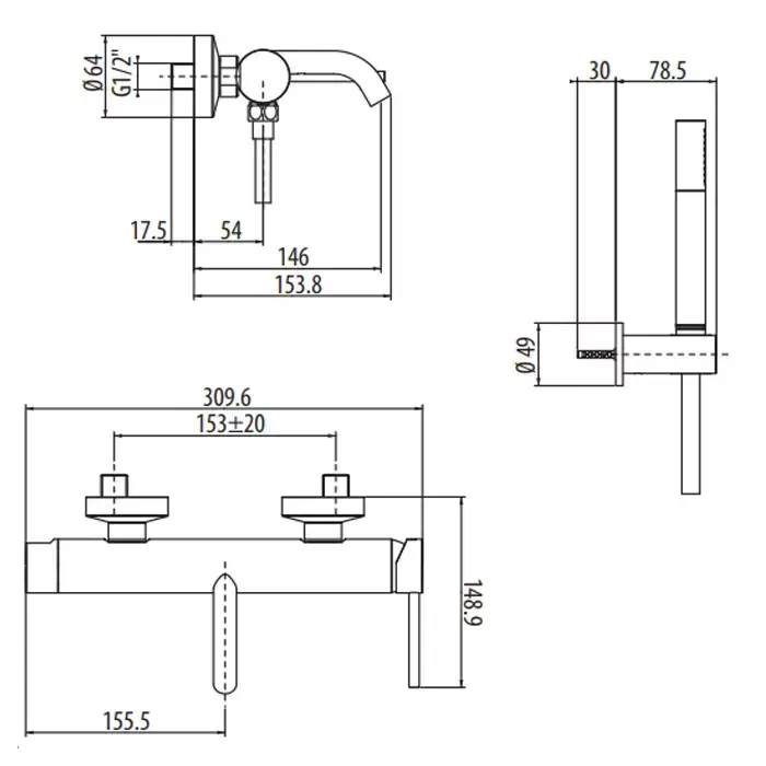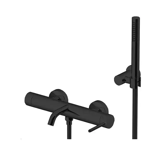 Gattoni Circle Two Смеситель для ванны настенный излив, с ручной лейкой на держателе,146 мм, цвет: черный матовый