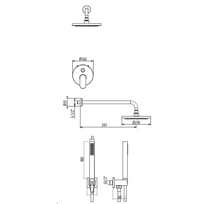 Gattoni H2Omix7000 Комплект для душа со смесителем встроенным на 2 выхода, ручным душем 6386/PD с держателем и верхним душем 250 мм, цвет: Nickel Spazzolato