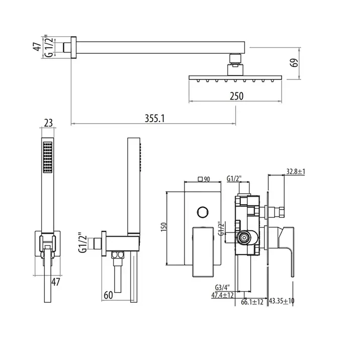 GATTONI KUBIC Душевой набор со смесителем встраеваемый в стену, цвет: хром
