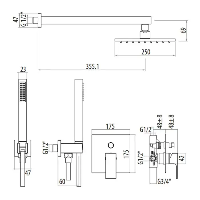 Gattoni Kubik Душевой набор со смесителем встраеваемый в стену, ручной лейкой и верхним душем 250х250 мм, цвет: черный матовый (с внутренней частью)
