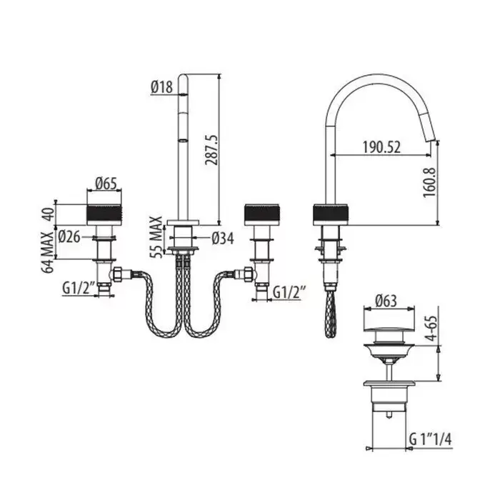 Gattoni MD Смеситель для раковины, 3 отв., ручки RONCO, с донным клапаном, цвет: черный матовый