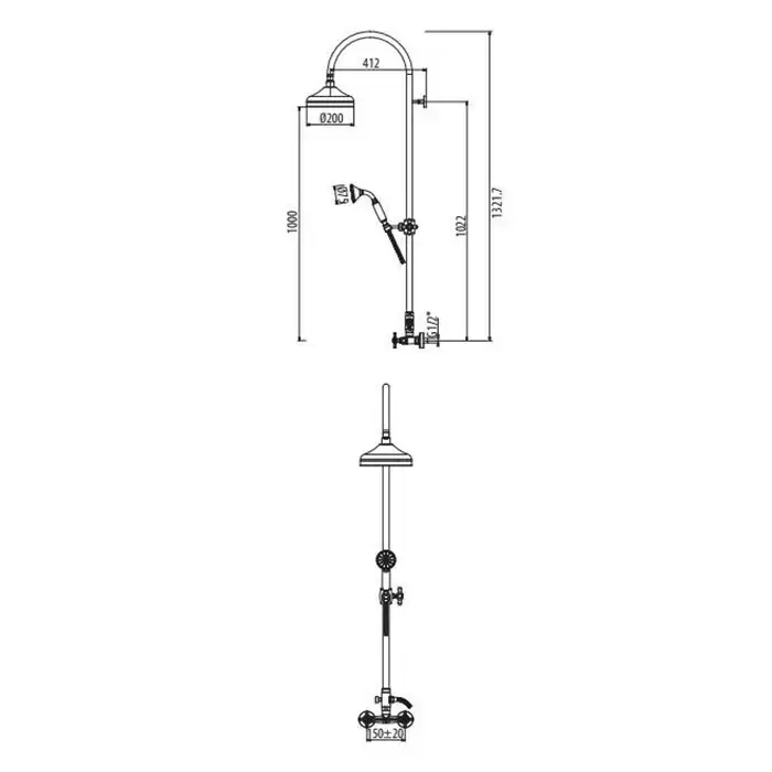 Gattoni TRD Душевая стойка, верхний душ Ø20см., смеситель, ручной душ, шланг, цвет: золото 24К