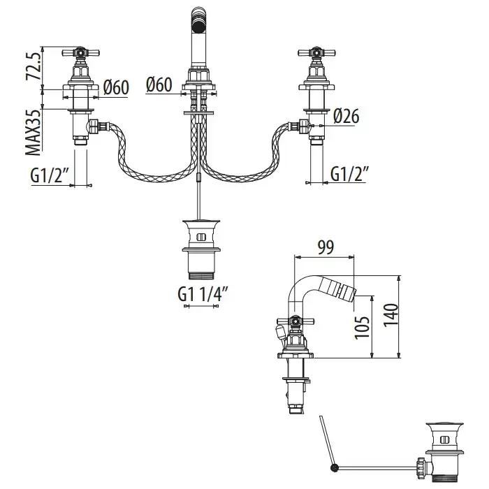 Gattoni TRD Смеситель для биде, 3 отв., ручки Paris, цвет: хром